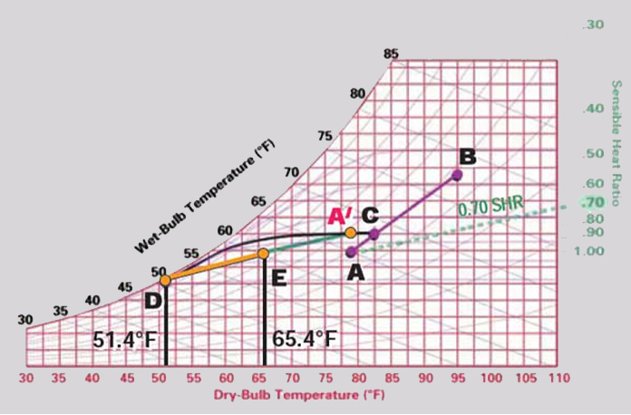 • با افزایش مقدار ضریب کنار گذر (B.P.F)، فاصله بین نقاط E و D بیشتر میشود و در نتیجه هوای خروجی کمتر به شرایط ایدهآل کویل نزدیک میشود.