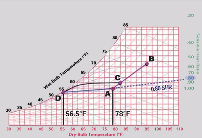 در نتیجه، فرایند روی نمودار سایکرومتریک به صورت ترکیبی از کاهش دمای خشک هوا و کاهش رطوبت مطلق نمایش داده میشود و هوا پس از عبور از کویل، هم خنکتر و هم خشکتر خواهد شد.