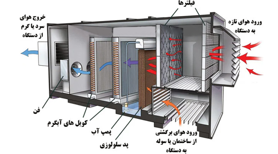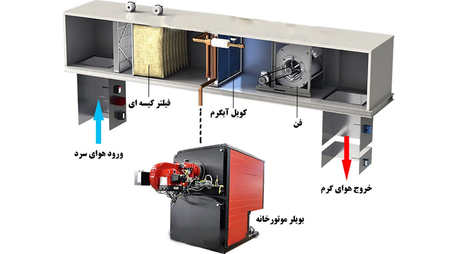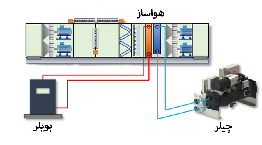 یکی از کاملترین و دقیقترین راهکارها برای انبارهایی که کنترل همزمان دما، رطوبت و کیفیت هوا اهمیت بالایی دارد، استفاده از چیلر (تراکمی آبخنک یا هواخنک) بهعنوان واحد سرمایشی، بویلر بهعنوان منبع گرمایشی و هواساز صنعتی برای توزیع و فیلتر کردن هوا و همچنین تنظیم رطوبت است. این ترکیب برای انبارهایی که کالاهای حساس مانند مواد غذایی، دارویی یا تجهیزات خاص نگهداری میشود، ایدهآل است.