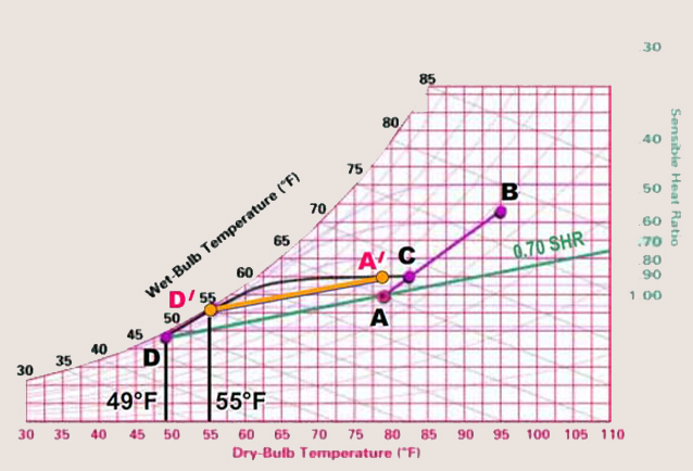 اگر بر روی نمودار سایکومتریک نقطهی شرایط طرح داخل (دمای خشک و رطوبت نسبی مطلوب محیط) مشخص شود و از آن نقطه خطی به سمت شرایط هوای خروجی از کویل سرمایی رسم کنیم، شیب این خط نشاندهندهی مقدار SHR خواهد بود.